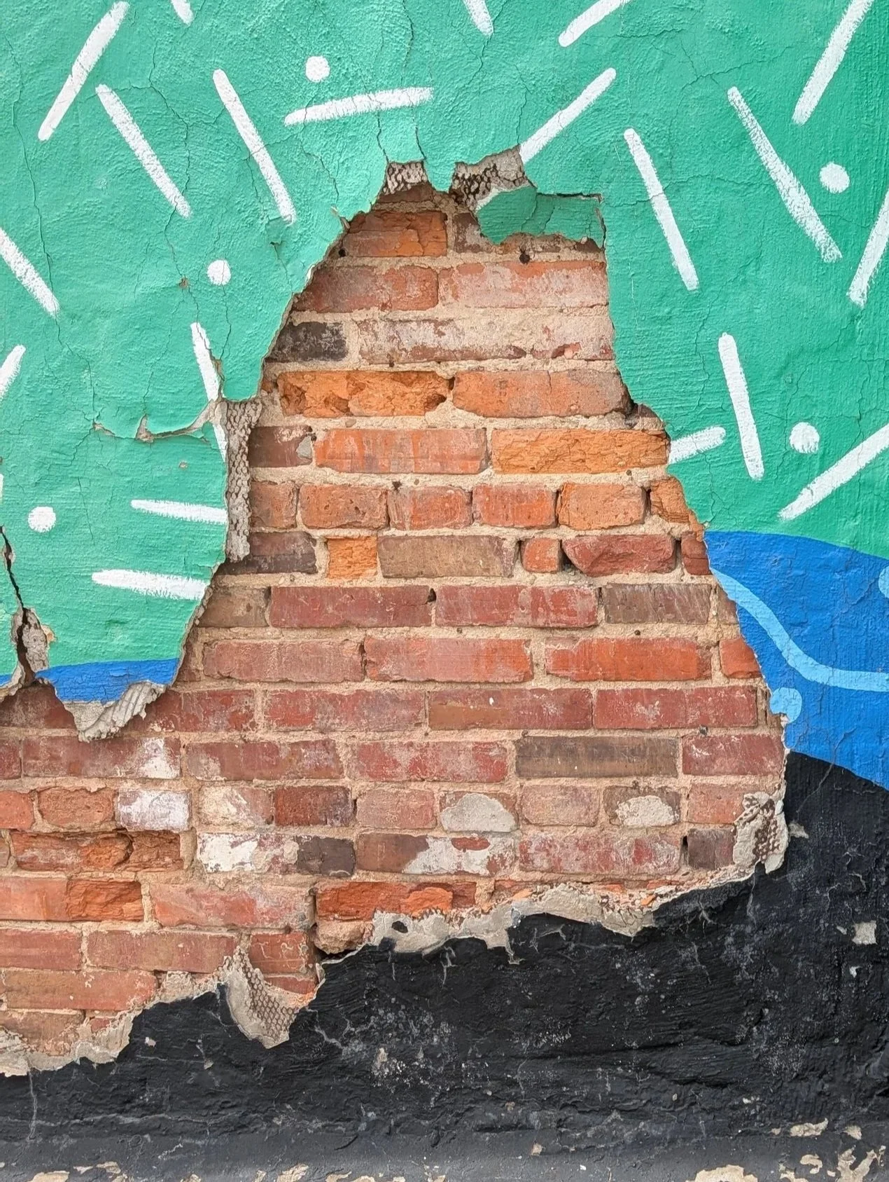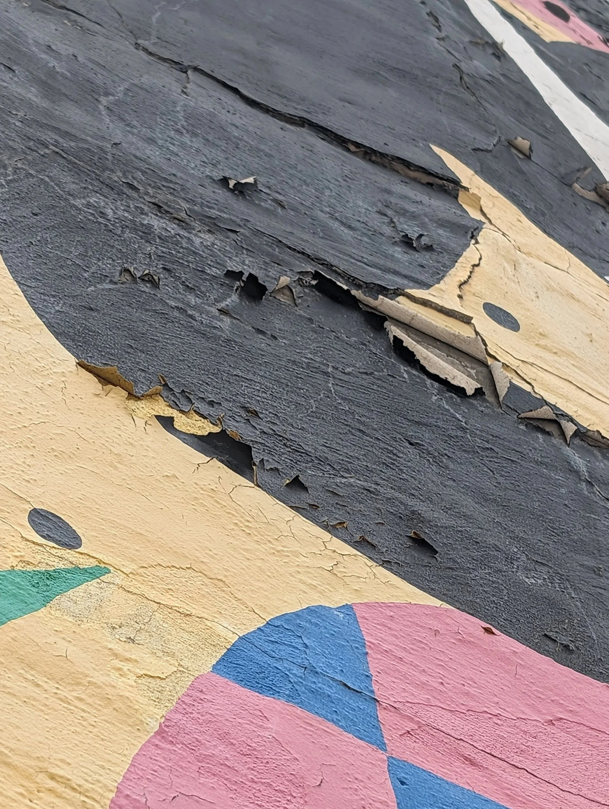 However Far A Stream Flows, It Never Forgets It’s Source (1991) by Tom Miller is peeling and flaking across large areas, brick is exposed, cracks run through the surface, and moisture has penetrated behind the paint layers. Additionally vegetation emerging from the wall confirms active structural deterioration. Despite restorations in 2004 and 2008, the mural has reached a point where routine maintenance is no longer enough. Without immediate professional conservation, additional sections of the artwork will be permanently lost.