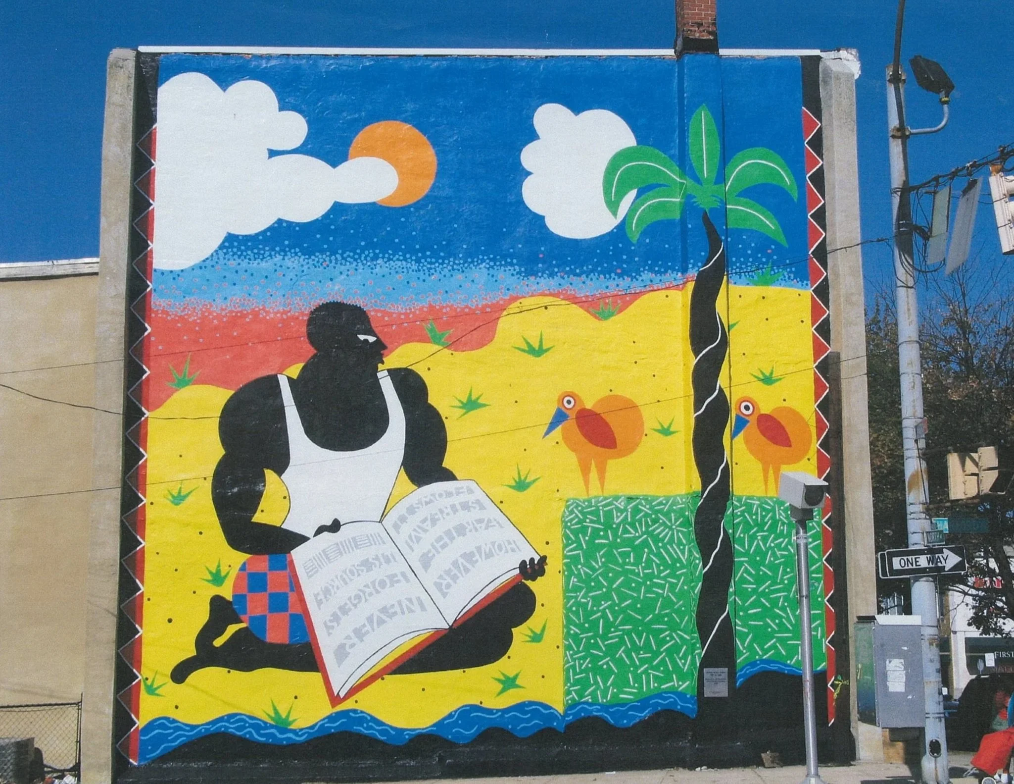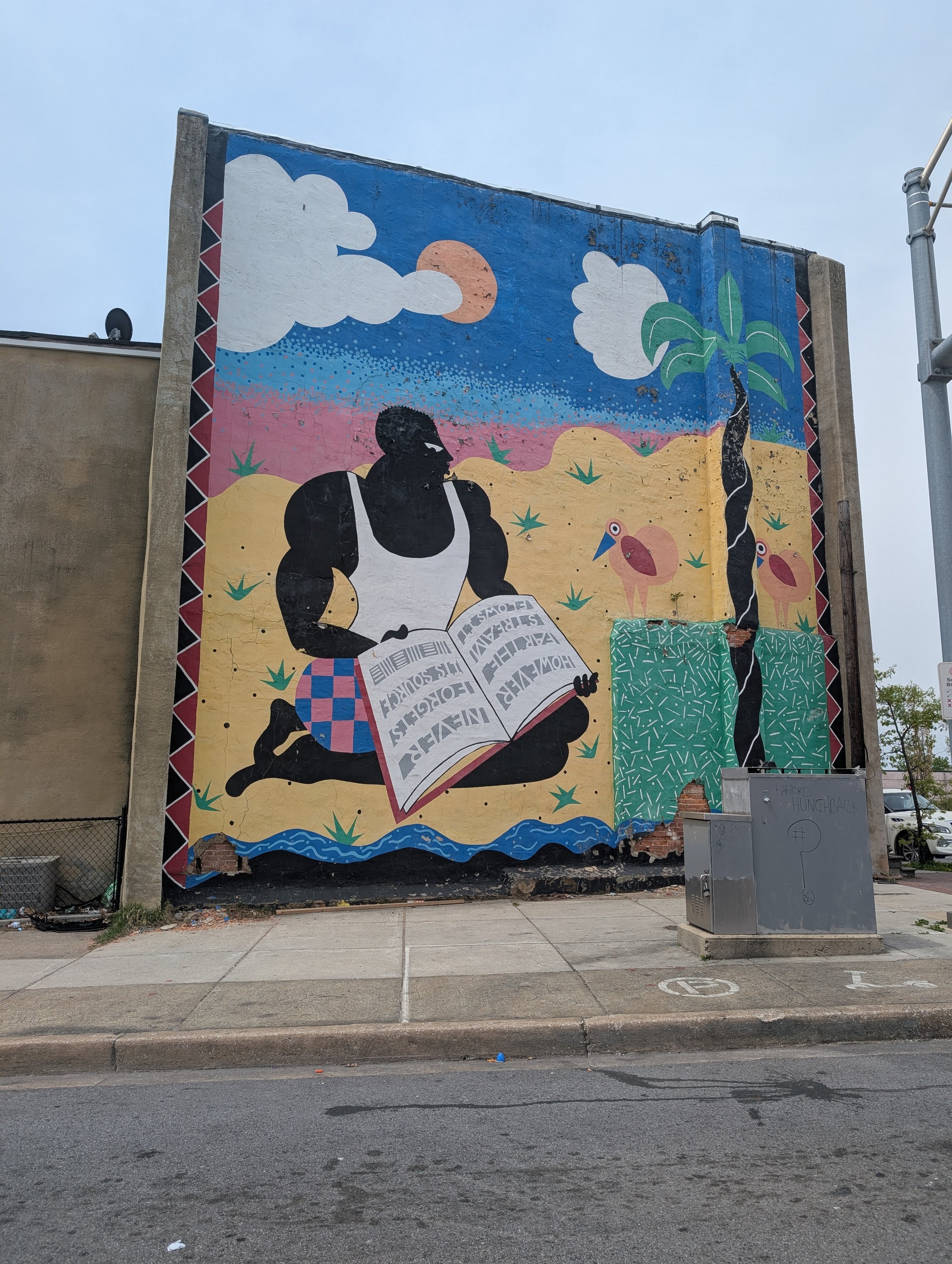 The mural depicts a Black male figure seated on a beach holding an open book. The book bears an African proverb, often attributed to Yoruba tradition: “However far the stream flows, it never forgets its source,” emphasizing the importance of remembering one’s origins and heritage. Measuring approximately 40 x 40 feet, the mural is one of six public murals Miller created in Baltimore between 1991 and 1998, three of which remain today.